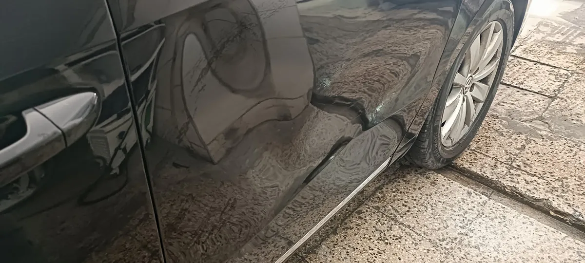Passat boyasız onarım - 02Araç sahibi, sol kapı bölgesinde oluşan geniş ve derin göçük nedeniyle aracını Poyraz Teknik Kaporta Boya atölyemize getirmiştir. İlk incelemede hasarın oldukça büyük olduğu ve klasik kaporta boya işlemleri ile onarılmasının daha yaygın bir yöntem olacağı düşünülmüştür. Araç sahibi de ilk etapta hasarın boyasız yöntemle düzelmeyeceğini ve mutlaka boya gerektireceğini düşünerek aracını teslim etmiştir.